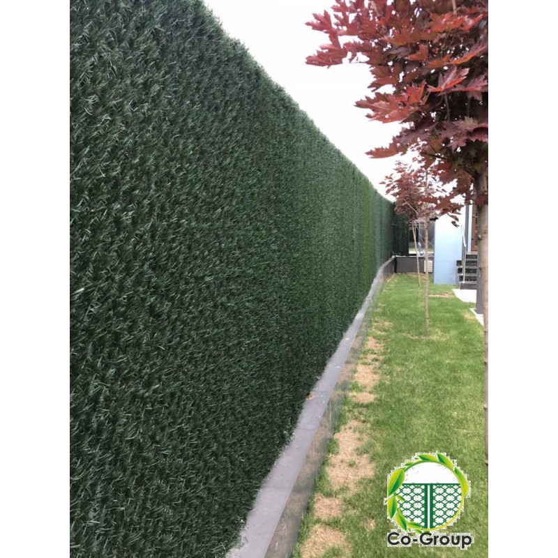 Декоративна зелена штучна огорожа виготовляється з незаймистого, довговічного, високотехнологічного ПВХ-матеріалу, який є екологічно чистим, має захист від ультрафіолетових променів і виглядає максиматьно наближено до натуральної хвої та трави. Декороративне покриття закріплене на двошаровій сітці рабиця з ПВХ покриттям зеленого кольору, товщина основи дроту сітки рабиця складає 2, 5 мм подвійного плетіння (2,5мм*2) з ПВХ покриттям, завдяки чому наша унікальна огорожа є міцною та зносостійкою.