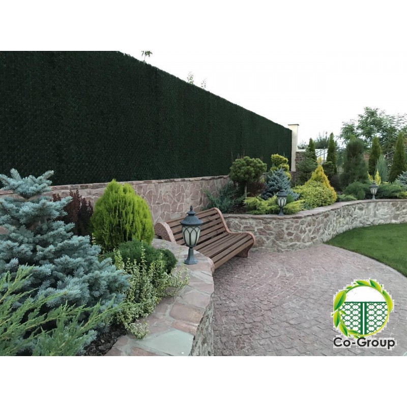 Декоративна зелена штучна огорожа виготовляється з незаймистого, довговічного, високотехнологічного ПВХ-матеріалу, який є екологічно чистим, має захист від ультрафіолетових променів і виглядає максиматьно наближено до натуральної хвої та трави. Декороративне покриття закріплене на двошаровій сітці рабиця з ПВХ покриттям зеленого кольору, товщина основи дроту сітки рабиця складає 2, 5 мм подвійного плетіння (2,5мм*2) з ПВХ покриттям, завдяки чому наша унікальна огорожа є міцною та зносостійкою.
